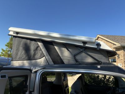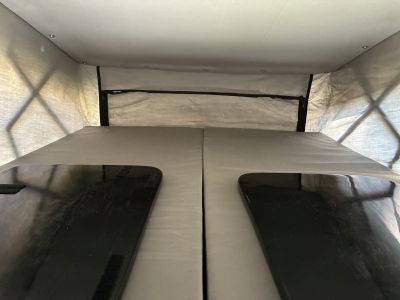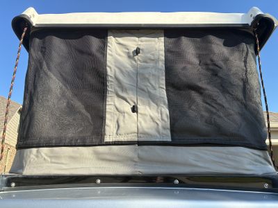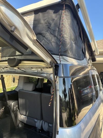 - There are two clips on the top of the back of the inner roof which engage with fittings on the fiberglass roof. We have been unable to adjust these clips correctly, or they are not working. We have removed them. The rear of the roof is now secured with cords which are attached at the top to the fiberglass roof, and wrap around the gas strut fittings on the rear window at the bottom. We have kept the clips, and the release cables for the clips are still in place, so you can restore them if you wish.